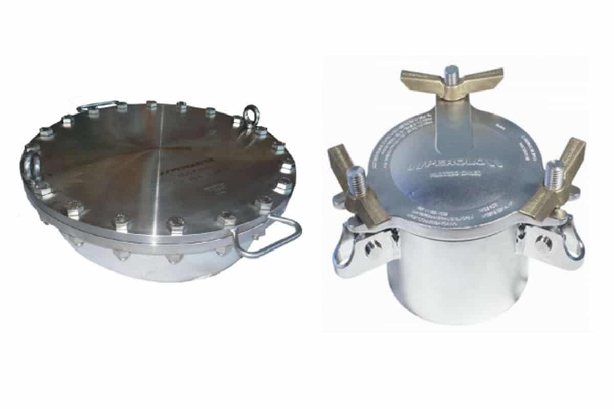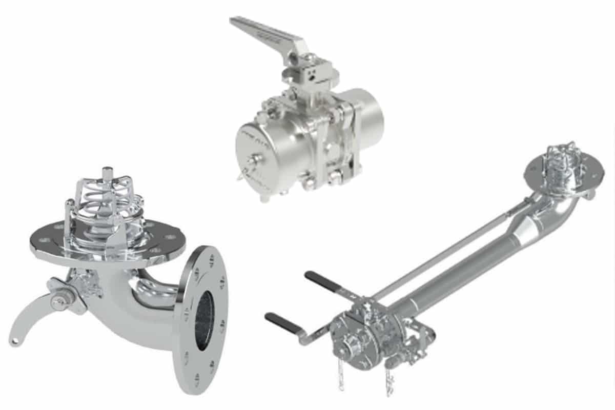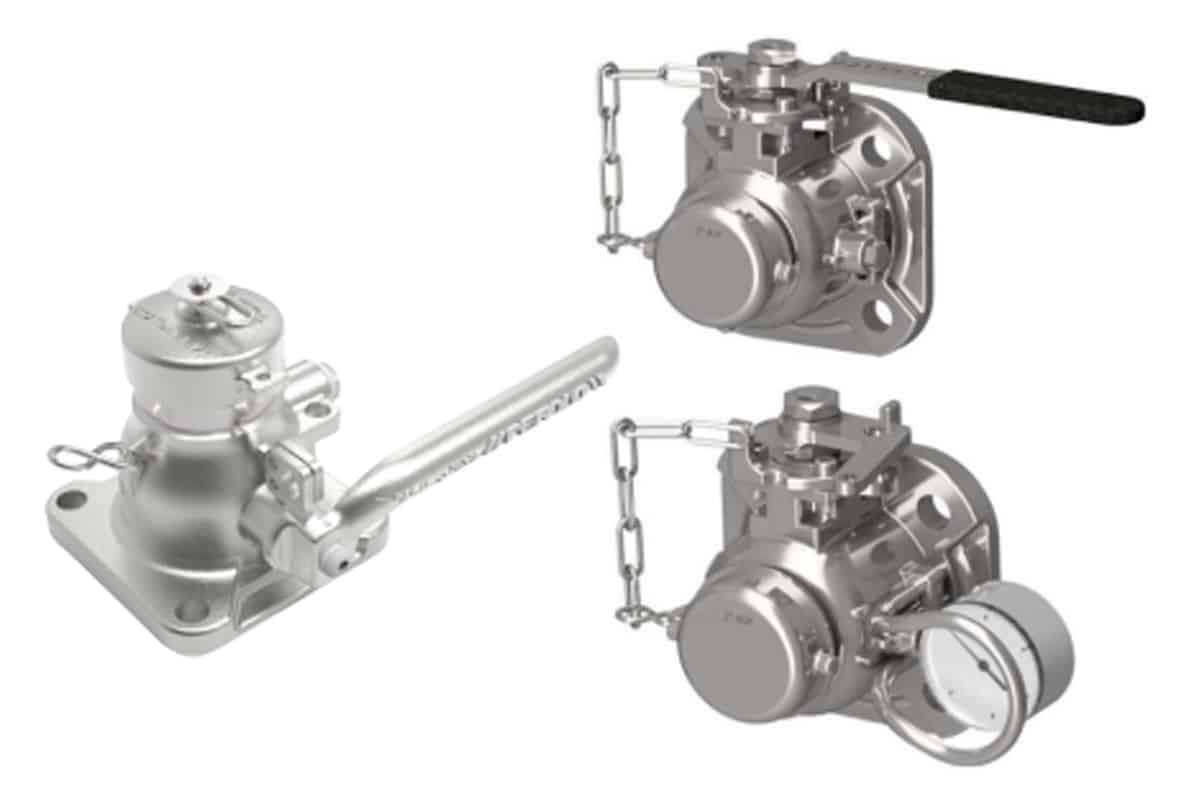 Las válvulas inferiores para descarga, las válvulas de seguridad, las de ventilación, puertas o accesos de limpieza (registros), y otros accesorios, diseñados para ajuste en espacios reducidos, con conexiones estándar (rosca, brida) y compatibles con las normas de los contenedores paletizables.