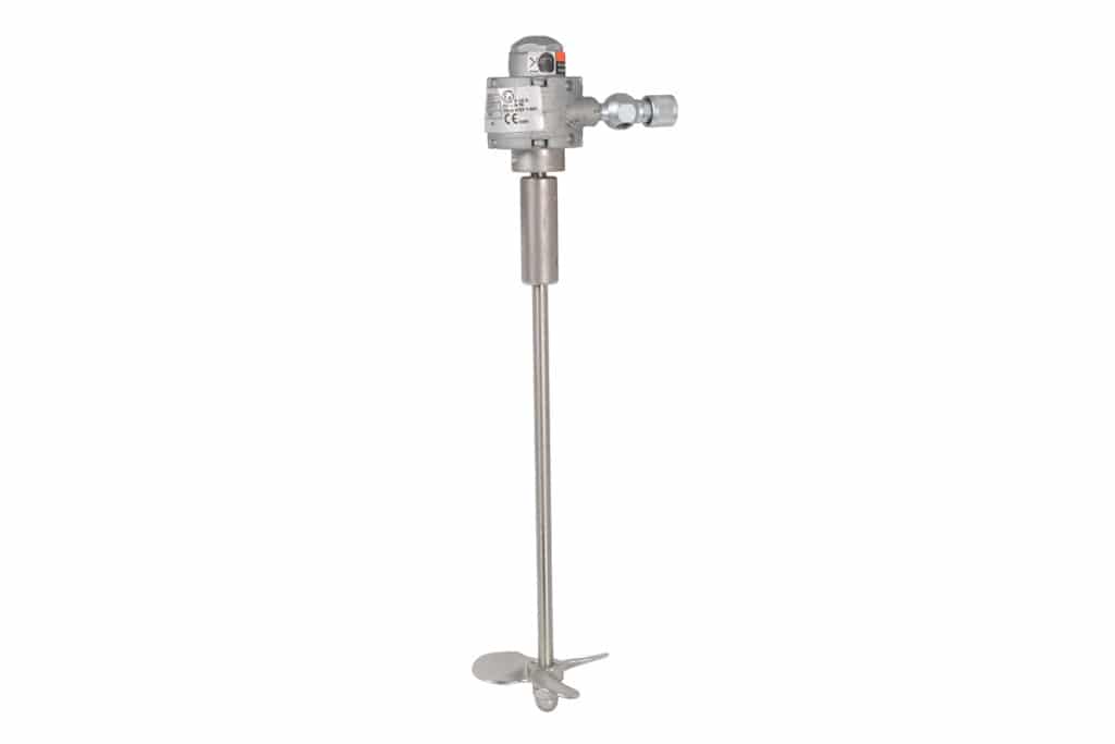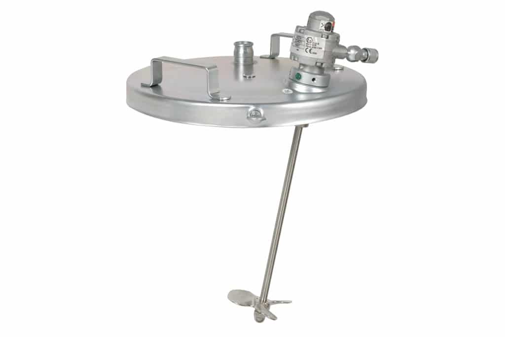 está accionado por aire con presiones de 7 bar. Está disponible para cubos de 19 o 38 litros. Sus dimensiones son 33,6cm de longitud fabricado en acero inoxidable y soporte redondo. Cumple, además, con la normativa ATEX.