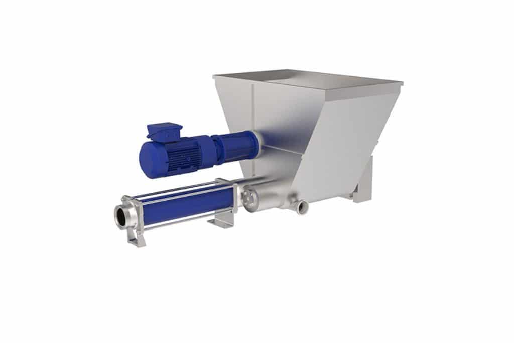 Versión con tolva, doble sinfín de prealimentación de funcionamiento sincronizado y eje rompebóvedas. Los dos sinfines, trasladan el producto alimentando el estator de la bomba. Las palas del rompebóvedas rompen y empujan el producto hacia el fondo de la tolva.