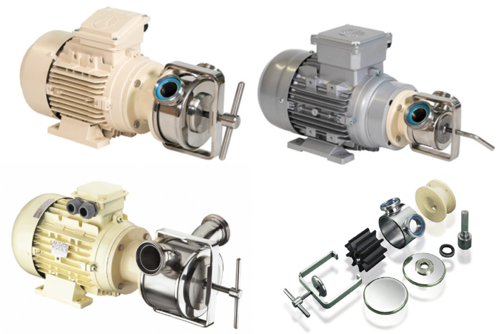 Con cuerpos de las bombas están fabricados íntegramente en acero inoxidable 316 L. La turbina es fabricada en nitrilo sanitario, con certificado según las normas FDA del L.G.A.I. Technological Center. Las bombas sanitarias aportan una gran facilidad de limpieza, permitiendo su desmontaje en pocos segundos y sin necesidad de herramientas. Su estudiado diseño permite una total visualización de todas las partes en contacto con el producto, ya que no existen puntos ciegos donde puedan desarrollarse las bacterias.