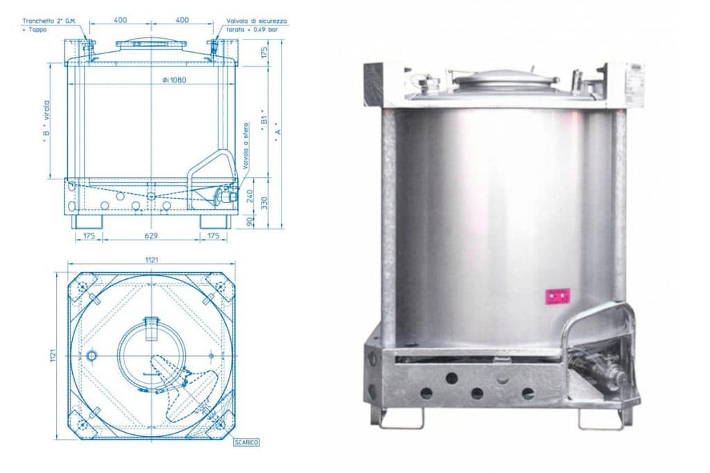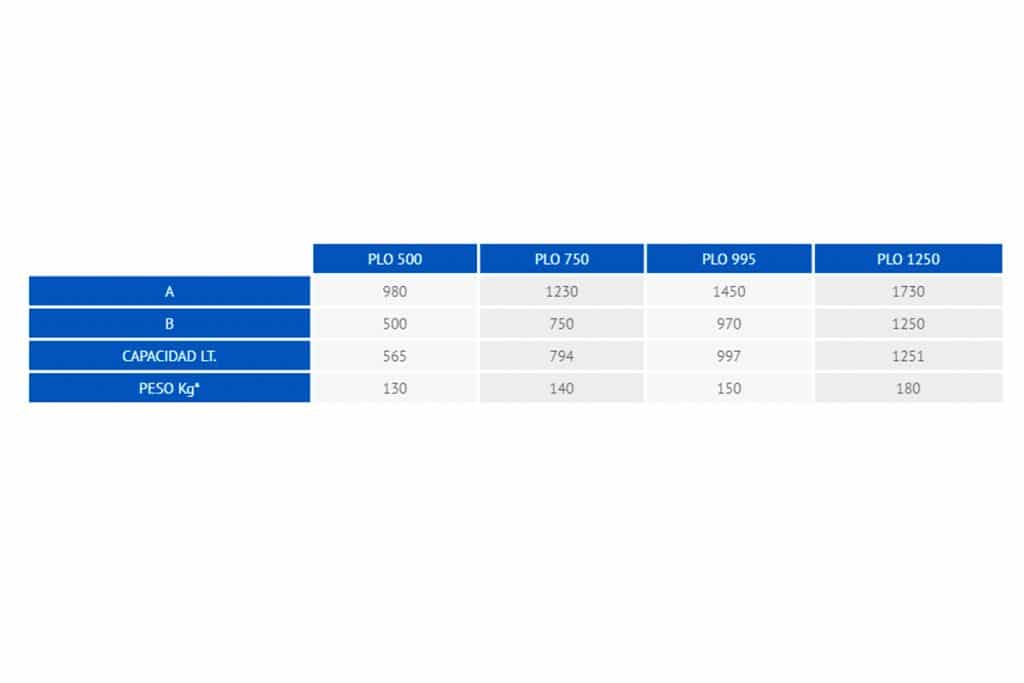 Los contenedores AZZINI modelo PL y PLO se construyen en acero inoxidable laminado en frío y el PL en cinco medidas diferentes: 565, 750, 997, 1.251 y 1.500 litros. Todas las soldaduras de sus componentes se realizan mediante sistema TIG y los cordones externos e internos son decapados. También Bajo pedido pueden ser pulidos.