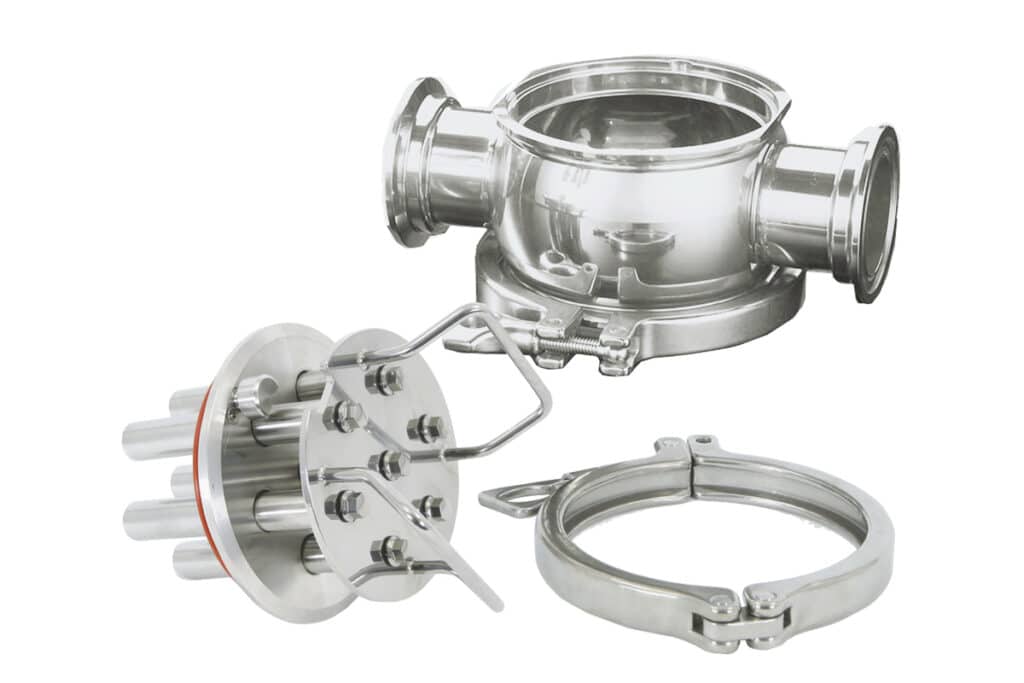 Está disponible en 7 tamaños, con diámetros desde 50 hasta 125mm y tiene una conexión aséptica según la norma DIN-11864. También se puede fabricar con extremos a soldar.