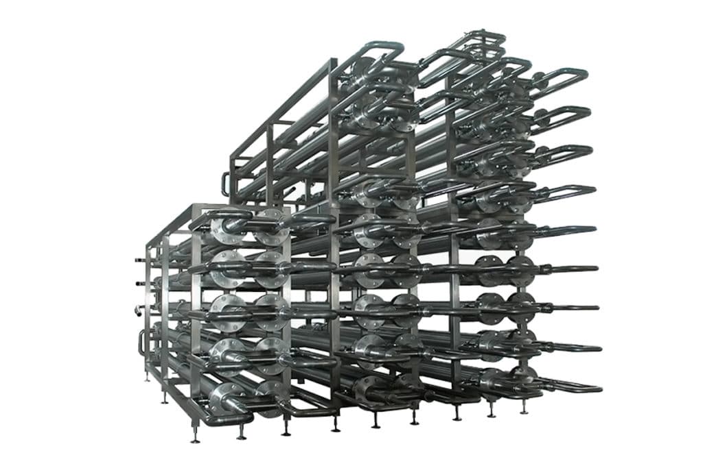 El intercambiador de calor MIXFLO anular sanitario está constituido por tres tubos concéntricos corrugados, con los lados de producto inspeccionables.