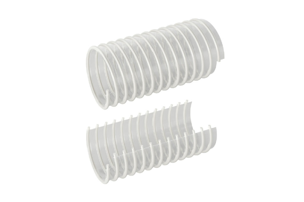 Manguera antiabrasiva de poliuretano poliéter con espiral de PVC rígido para trasvase de sólidos en forma de partículas más gruesas como grano, granza, etc. que se puede usar en cualquier sector.