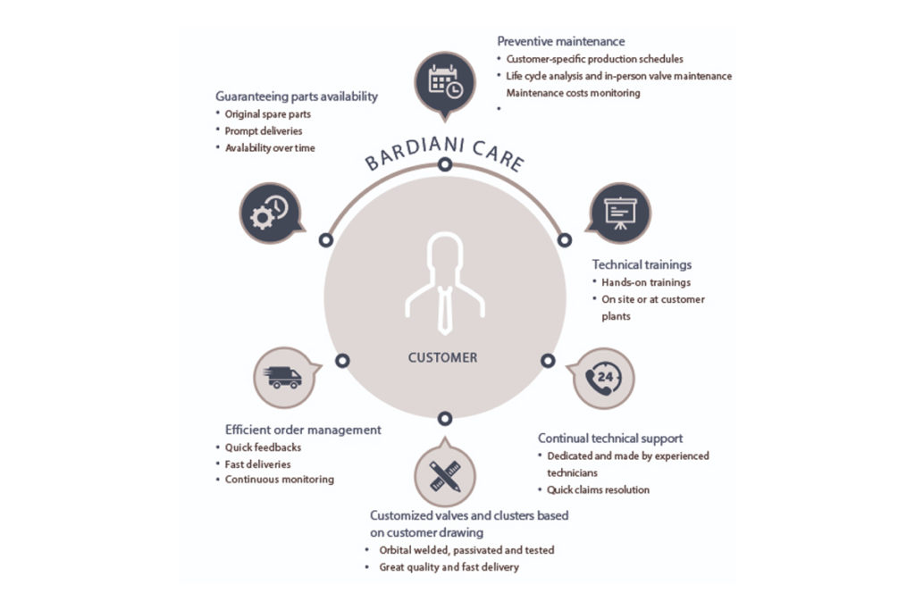 El programa Bardiani Care prevé el registro detallado y el control periódico del estado general de las válvulas mediante inspecciones programadas. Es posible aumentar la eficiencia de los componentes, reducir al mínimo las anomalías y tener bajo control los costes.