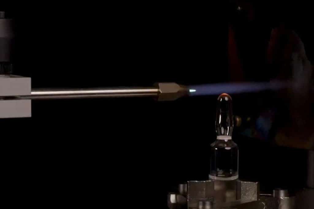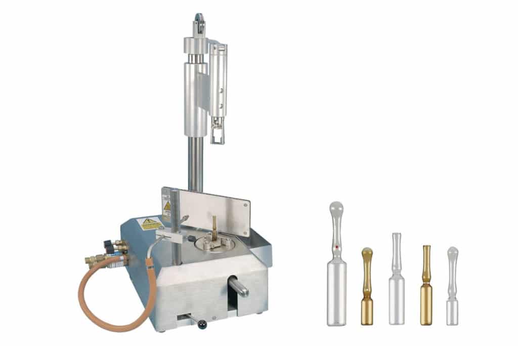Las ampollas se colocan de forma manual en la máquina de apertura y se acerca a una llama que realiza la función de la apertura y el sellado gracias a una pinza que recoge la parte superior girando sobre su eje. El acabado es redondo y el proceso es rápido con resultados similares a los de una máquina automática.