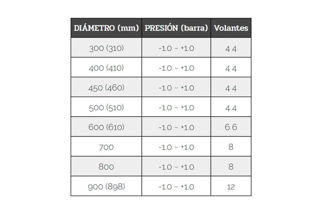 300 mm (310) / -1.0 ~ +1.0 Bar / 4 volantes, 400 mm (410) / -1.0 ~ +1.0 Bar / 4 volantes, 450 mm (460) / -1.0 ~ +1.0 Bar / 4 volantes, 500 mm (510) / -1.0 ~ +1.0 Bar / 4 volantes, 600 mm (610) / -1.0 ~ +1.0 Bar / 6 volantes, 700 mm / -1.0 ~ +1.0 Bar / 8 volantes, 800 mm / -1.0 ~ +1.0 Bar / 8 volantes, 900 mm (898) / -1.0 ~ +1.0 Bar / 12 volantes
