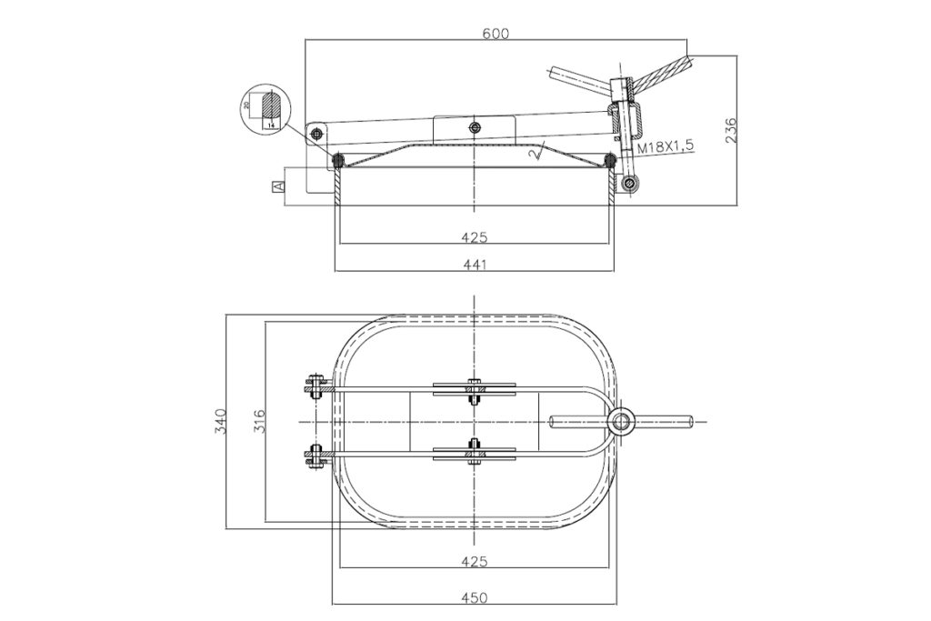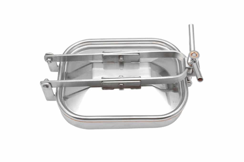 Puerta inoxidable rectangular con apertura horizontal exterior.
