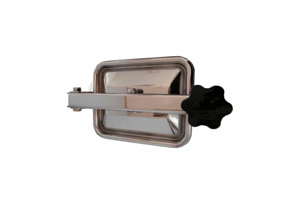 Puerta inoxidable rectangular con apertura horizontal exterior.