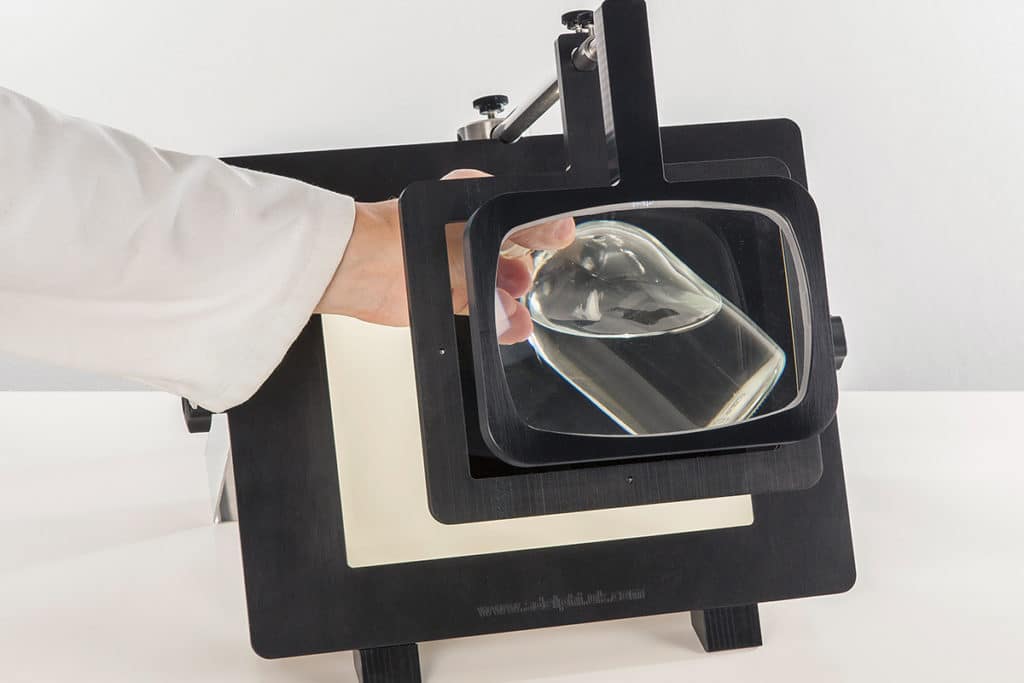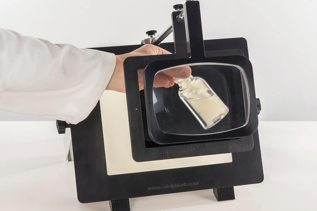 Se trata de un método sencillo para detectar las partículas visibles en líquidos transparentes en ampollas, frascos o viales. Se utiliza sobre todo en entornos farma y de laboratorios. El panel blanco se visualizan las partículas de color oscuro y en el negro las de colores claros.